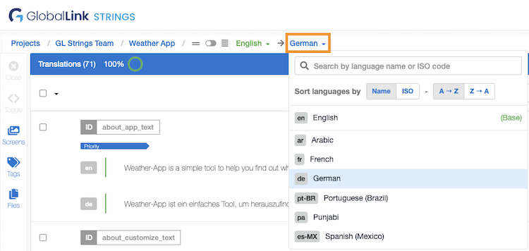 Work across multiple languages simultaneously: view, edit, search, and filter all draft/target strings at once for any set of selected languages.