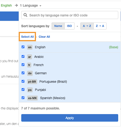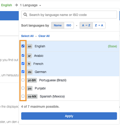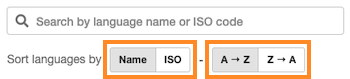 When selecting languages in the language dropdown, languages are sorted by Name in A → Z order by default. You can adjust sorting by: