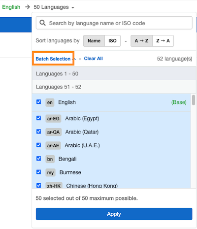 Batch Selection: Click the Batch Selection dropdown to select a batch of 50 languages at a time